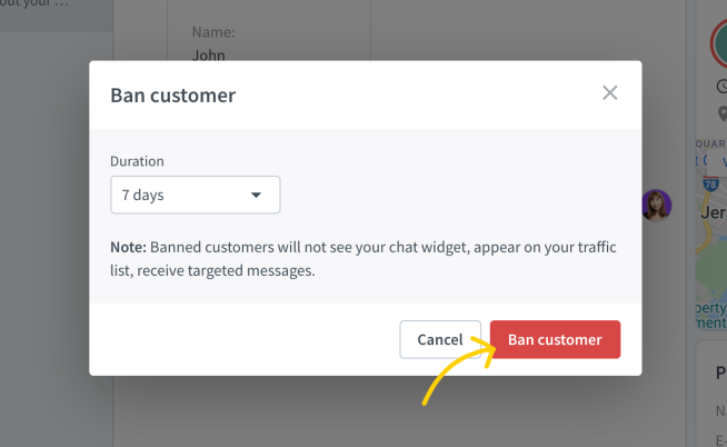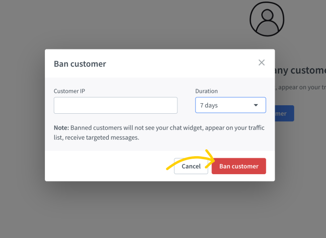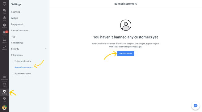 If closing the chat is not enough and a customer keeps causing trouble, you can ban them. Banning prevents customers from using your chat, but it won’t kick them off your website. Banned customers won’t see your chat, won’t appear in the Traffic section and will be ignored by automatic campaigns.