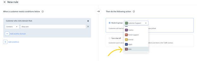 Once you’ve created a group for each website, you might want to route chats coming from certain sites (or pages) to a specific group. This way your agents will immediately know where the chat is coming from. Here’s how to do it:
