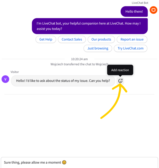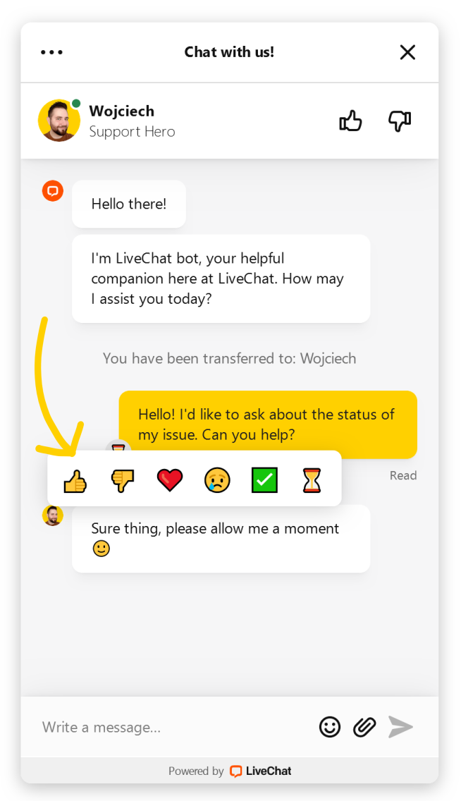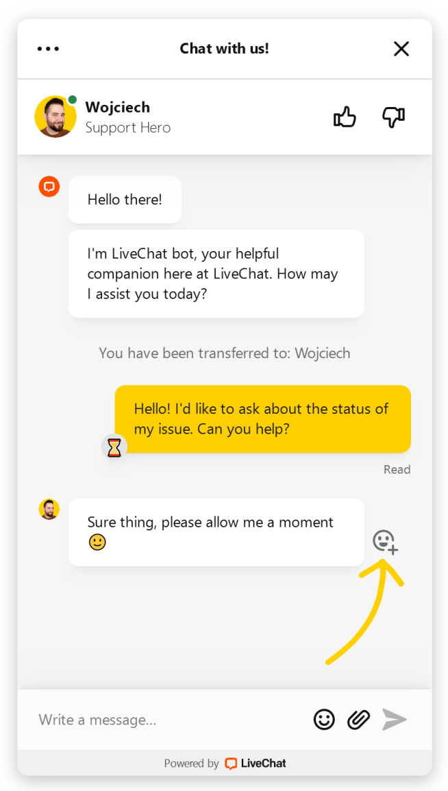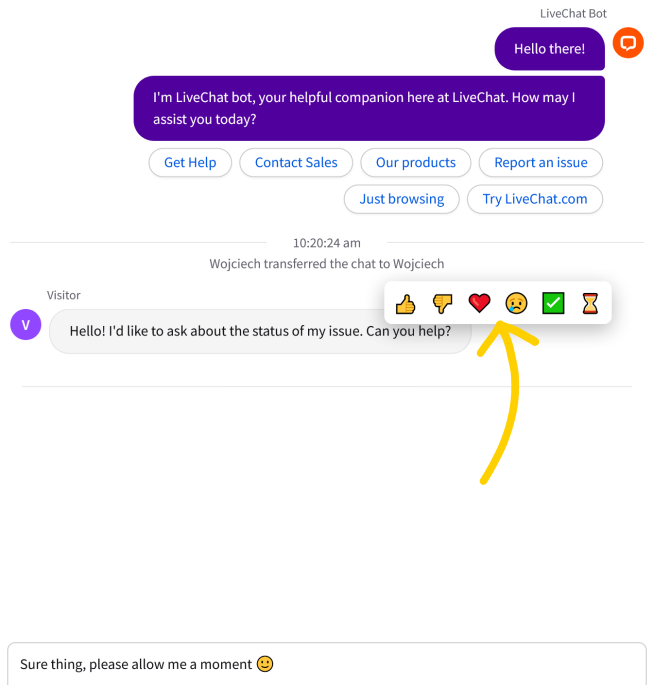 It’s a simple, fast, and convenient way to let each other know how you feel. For example, you can use the hourglass emoji to let a customer know that you’re looking into their query. Or leave them a heart emoji as a reaction to their positive feedback, it will encourage them to write more in the future.
