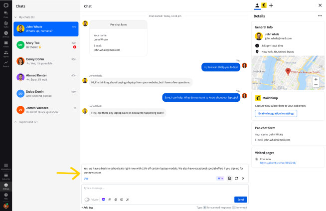 With reply suggestions you can add your knowledge bases, product pages, and more to the LiveChat Agent app and have the AI suggest answers in chats based on a very specific set of information. This means