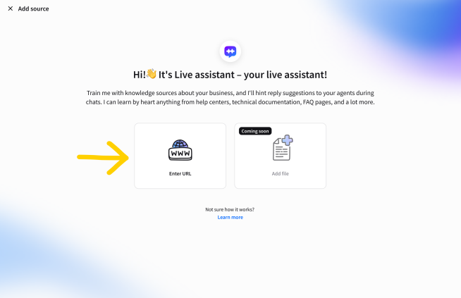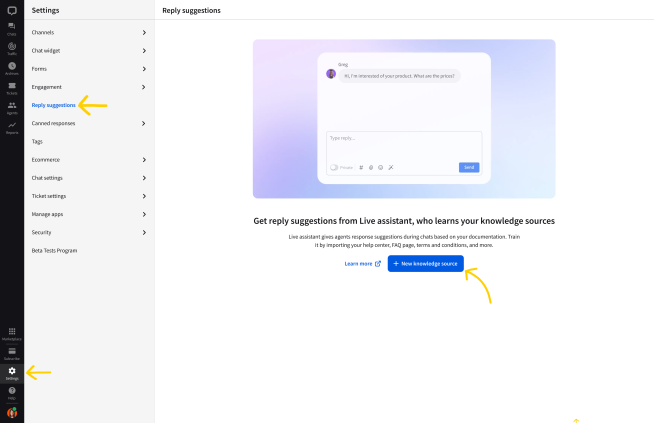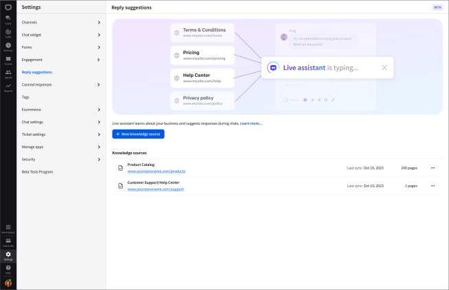 Before you start using reply suggestions, you need to add the knowledge sources that will inform the suggestions. You can add your knowledge base, product pages, terms of service, or frequently asked questions, and have the suggested responses be based on these sources.