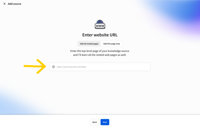 As you add the knowledge sources, you can decide if only the URLs you submit should be scanned for information, or if the sourcing should also include the URLs linked in the URL you’re adding.