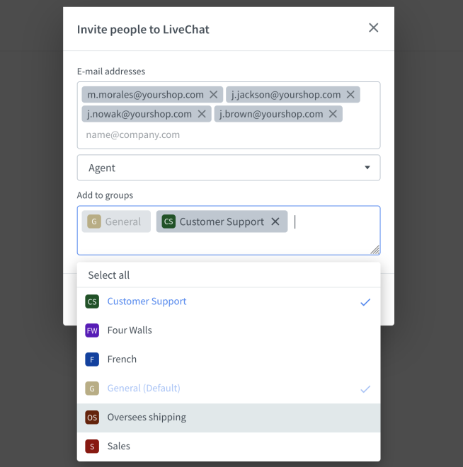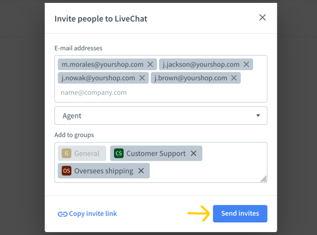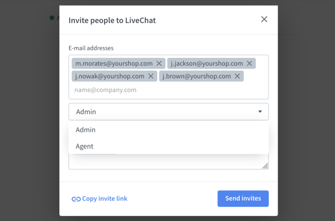 If you have an entire team waiting to join you in LiveChat, it might make more sense to send them an invitation link instead of adding them one by one.