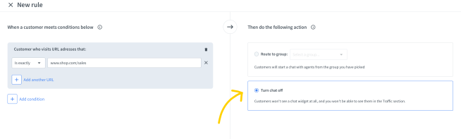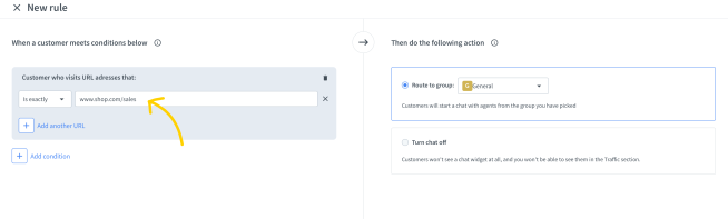 Enter the URL address of the page you want to route chats from.Use Contains to match a part of a page address. For example, you can cover all product pages by creating just one rule for all pages. The Is exactly option means that the entire page address must match. It’s useful when you want to use the rule for a specific page.