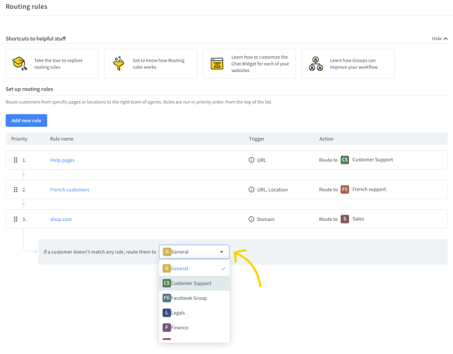 With Routing rules, you can direct chats to different teams, make sure customers from specific countries chat with agents who speak their language, customize the Chat Widget for each website, or turn off the Chat Widget on specific pages.
