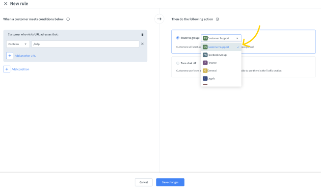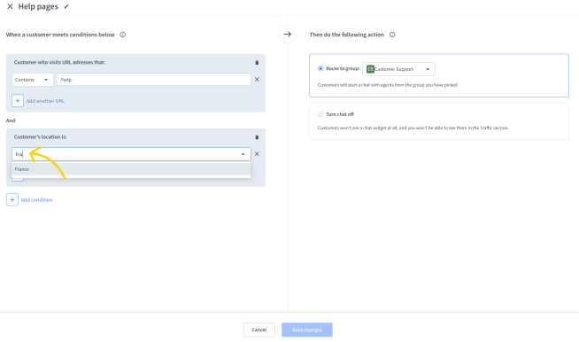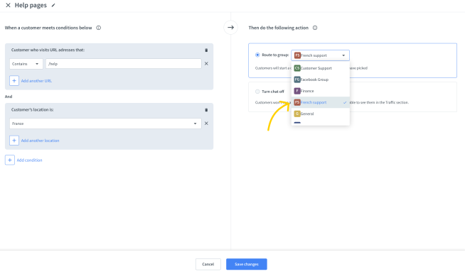 Finally, pick the group that should catch the chats coming from “/help” pages from customers in France.