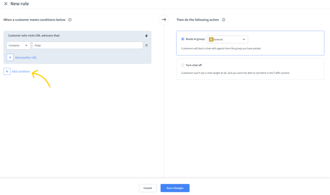 Log in to LiveChat and go to Settings>Chat settings>Routing rules and click on Add new rule.